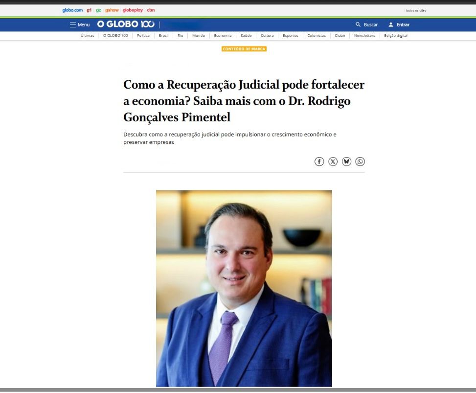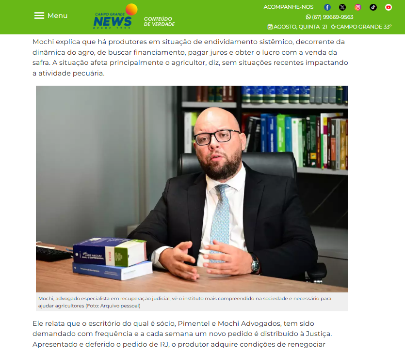 Nosso escritório foi destaque em veículos de grande alcance, como O Globo, Valor Econômico e Campo Grande News, comentando os impactos da crise econômica e a importância da Recuperação Judicial para empresas e produtores rurais.